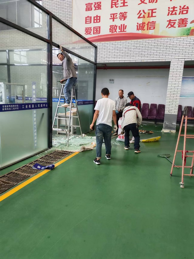 此外,针对实习车间部分窗户玻璃存在破损的问题,总务处安排了专项更换作业。工作人员精准测量、定制玻璃,安全有序地完成拆除与安装工作,并做好密封加固,有效排除了安全隐患,保障了实训场所的密闭性与安全性。