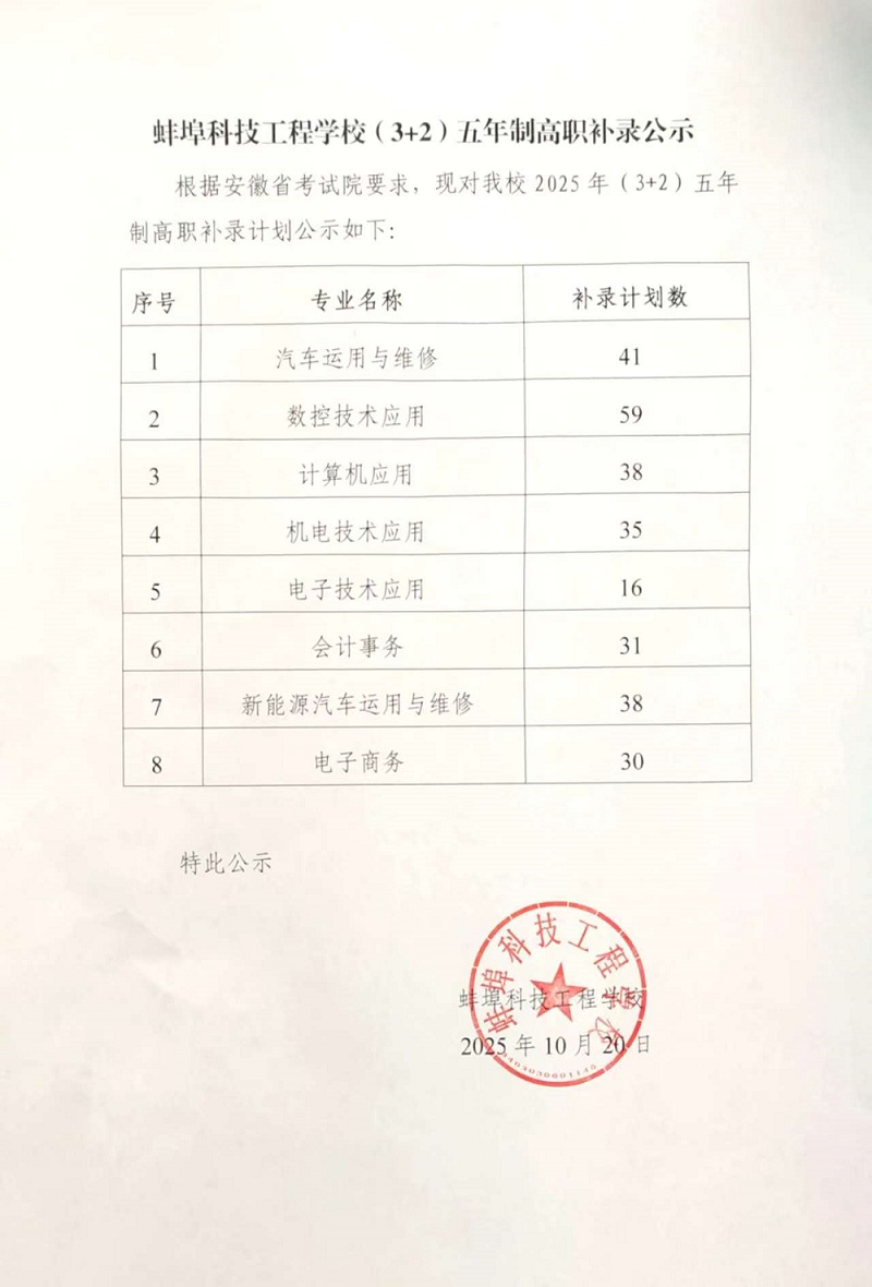 蚌埠科技工程学校(3+2)五年制高职补录公示