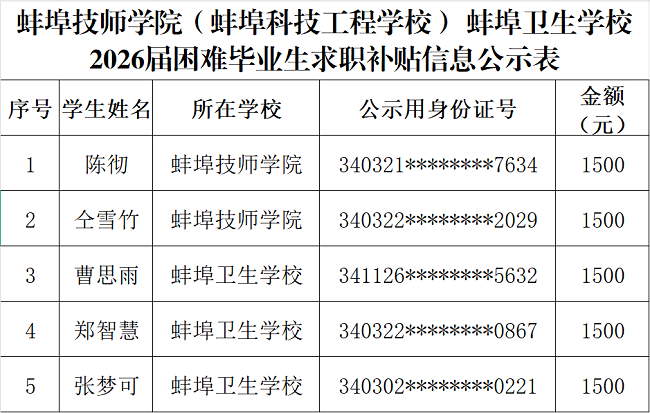 蚌埠技师学院(蚌埠科技工程学校) 蚌埠卫生学校 2026届困难毕业生求职补贴审核通过人员名单公示