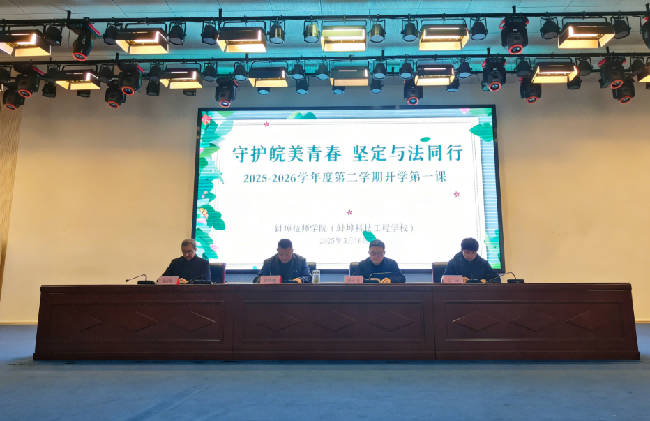 2026年3月16日,蚌埠技师学院隆重举行“2026年春季学期‘守护皖美青春 坚定与法同行’开学第一课”主题活动。院领导朱冬民、包太平、张文奇、陈垚出席仪式,党委书记朱冬民为学院全体学生讲授开学第一课。