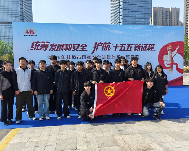 为深入贯彻总体国家安全观,落实蚌埠市团市委“国家安全 青春挺膺”主题团日活动周实施方案要求,切实增强广大团员的国家安全意识和责任担当,2026年4月15日上午,在第十一个全民国家安全教育日当天,蚌埠技师学院校团委精心组织36余名团员师生。,前往市民广场,参观由蚌埠市委国安办举办的2026年蚌埠市国家安全法律体系主题展览,以青春行动护航“十五五”新征程,筑牢国家安全青春防线。