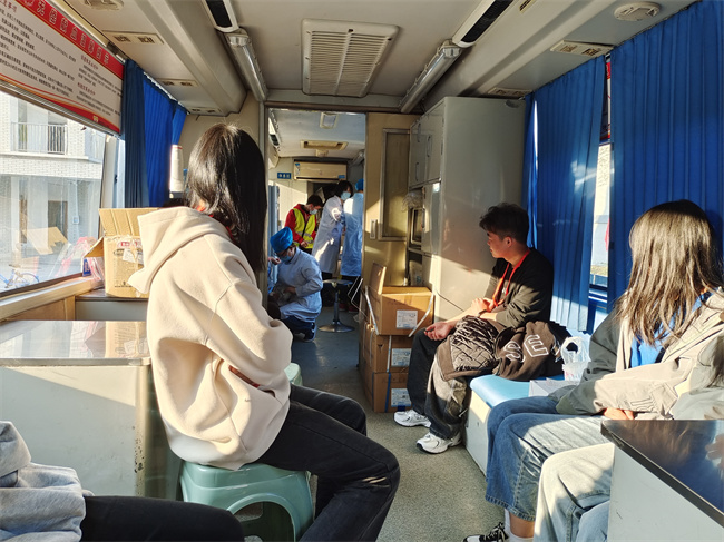 献血车一到教学楼,符合年龄的同学便排起了队。学生献血志愿者在工作人员的引导下,有条不紊地填表、体检、取样化验、接受血液采集;院领导陈华坤副院长亲临现场看望慰问参与献血的同学们,医务人员耐心地为志愿者解答有关献血的疑惑和问题,并告知他们献血后需要注意的饮食及健康生活习惯。现场还为献血志愿者们准备了糖水,帮助他们尽快恢复身体能量。献血结束后,学生处老师和医务人员逐一叮嘱同学们稍作休息,耐心讲解献血后注意事项,待确认身体无异常反应后方可离开。