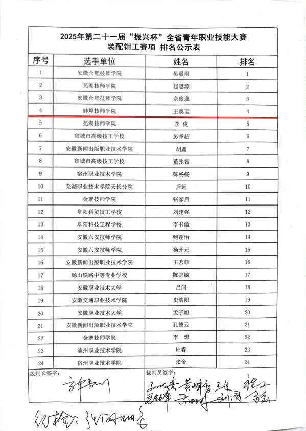 近日,2025年安徽省职业技能竞赛——第二十一届“振兴杯”全省青年职业技能大赛圆满落幕。我院机械工程系学生王奥运凭借精湛的技能和出色的表现,在装配钳工赛项中一路过关斩将,最终斩获银奖(全省第四名),为学院争得荣誉。