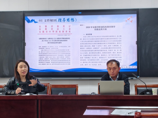 会上,安徽电子工程学校刘根富老师作专题分享。刘老师曾荣获去年省赛一等奖,他结合自身参赛经验,从比赛文件解读、比赛要求、材料点评等方面进行了深入细致的讲解。在文件解读环节,他逐条分析了比赛方案的核心要点和评分标准;在比赛要求部分,他重点强调了参赛材料的规范性、真实性和创新性;在材料点评环节,他结合各个参赛团队上报的材料,分析了存在的问题与改进方向。整场分享内容翔实、针对性强,既有理论高度,又有实践指导意义。