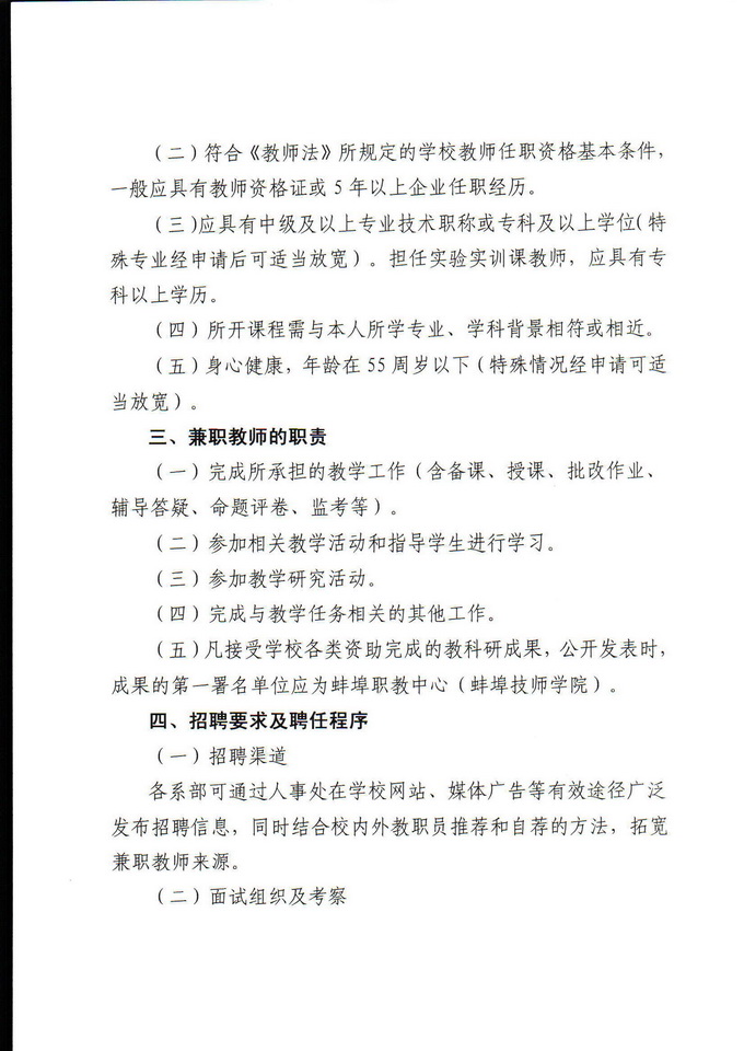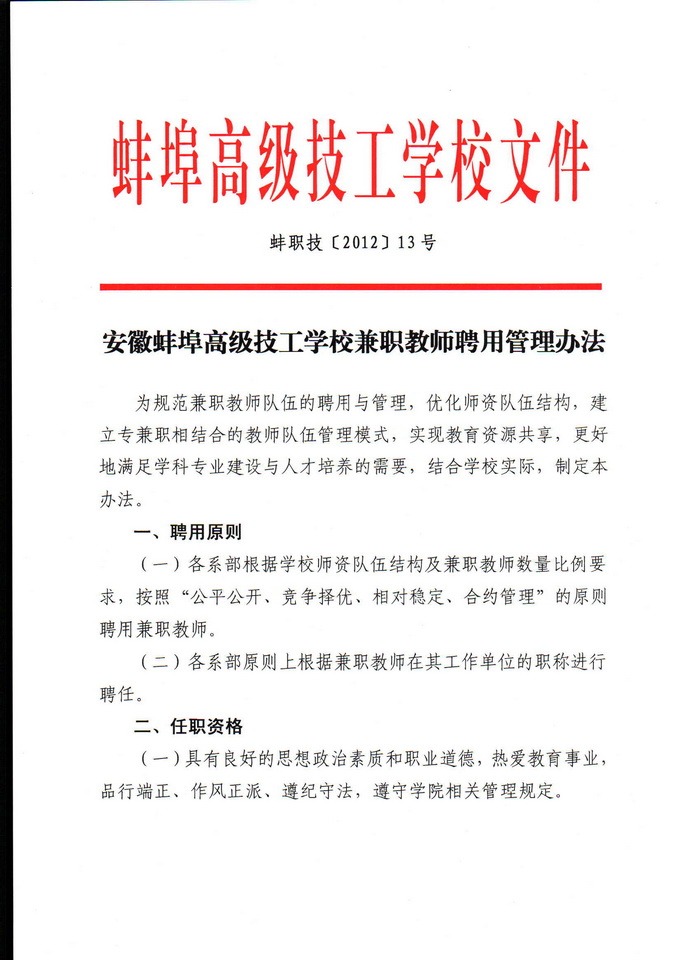 安徽蚌埠高级技工学校兼职教师聘用管理办法